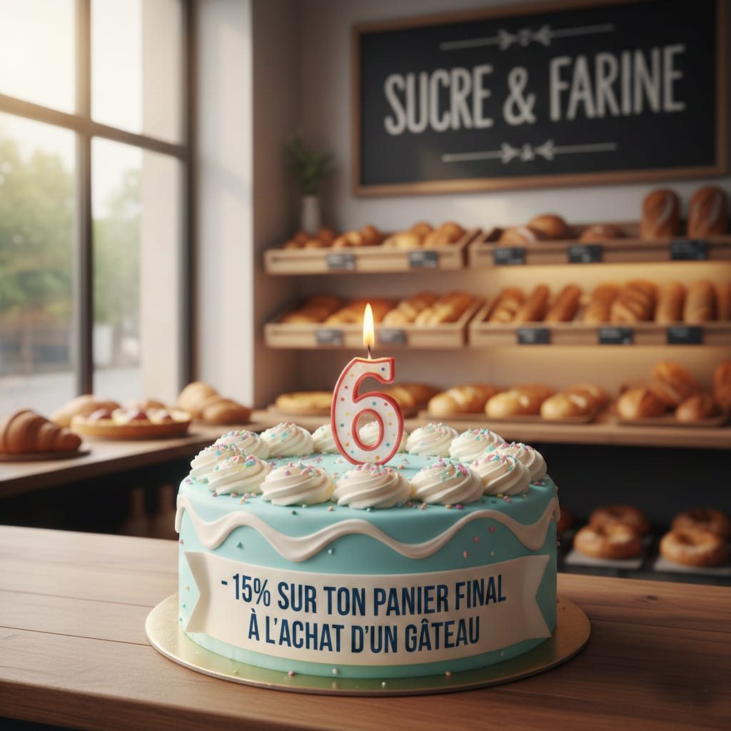ACHÈTES TON GATEAU à la boulangerie SUCRE & FARINE et obtiens ton code réduction de 15% valable sur tous les articles non soldés.